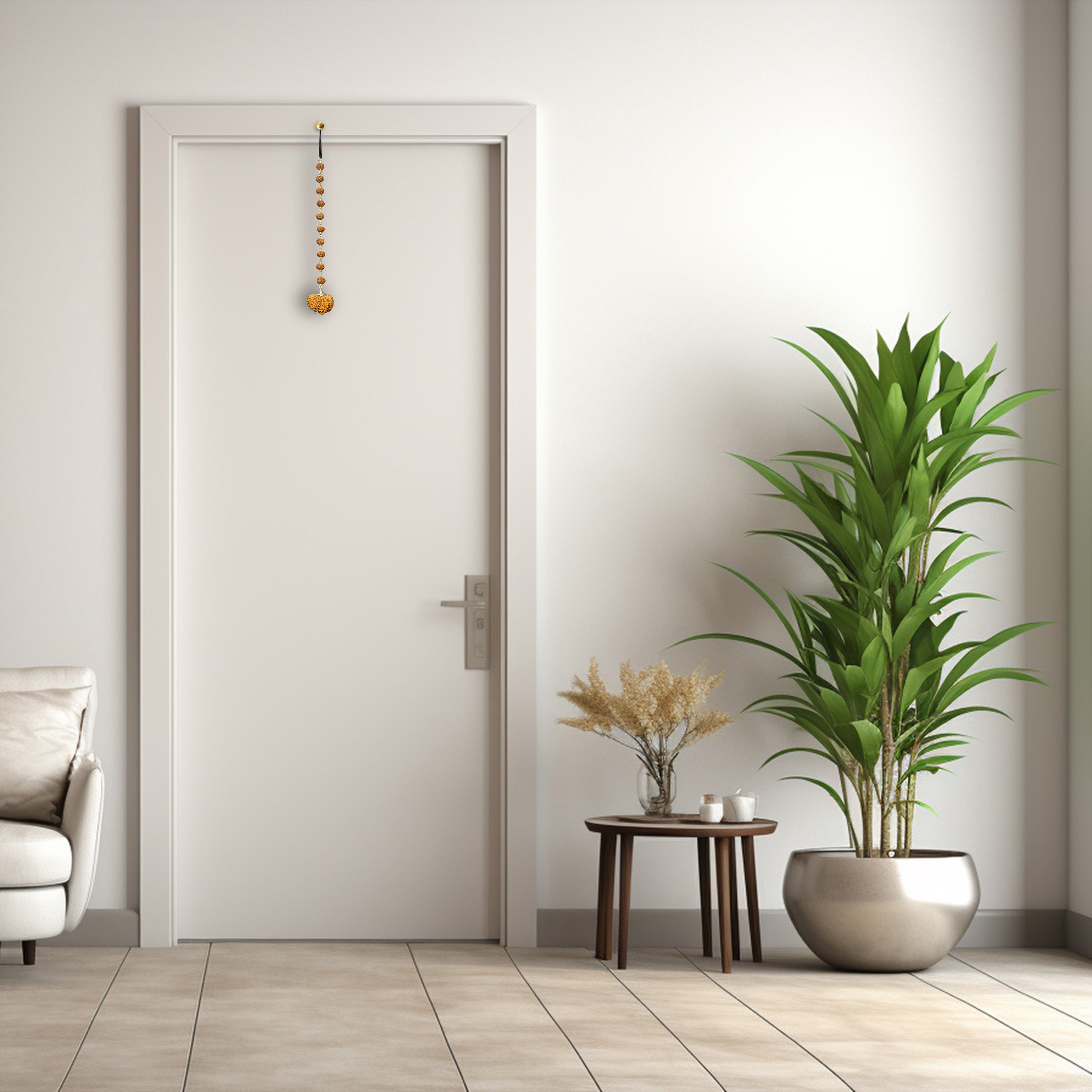 Designed to bring balance and harmony to your space, the Vastu Hanging features the sacred 10 Mukhi Rudraksha. As per traditional texts, this Rudraksha represents Lord Vishnu and shields the dwelling from negative energies. Ideal for home entrances, this hanging is believed to correct Vastu doshas and attract peaceful vibrations into the house.